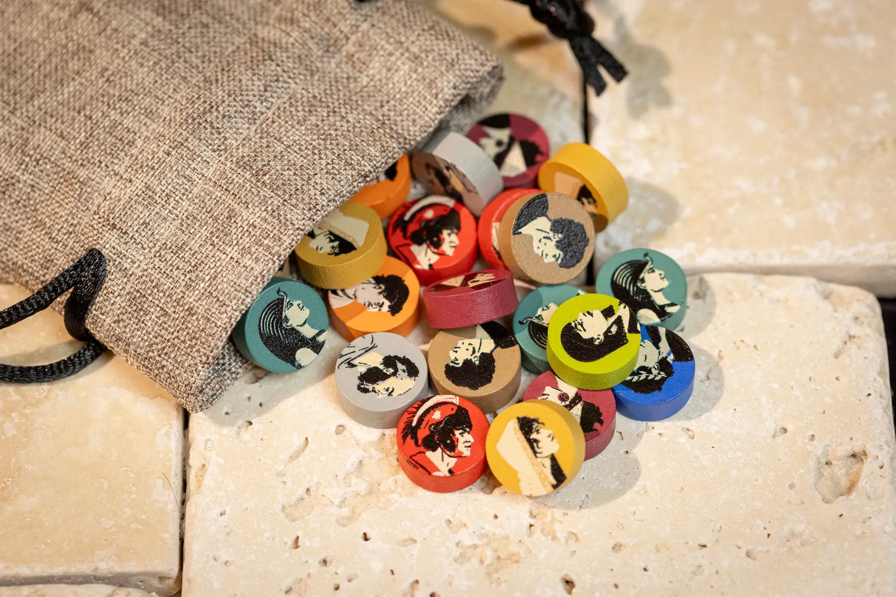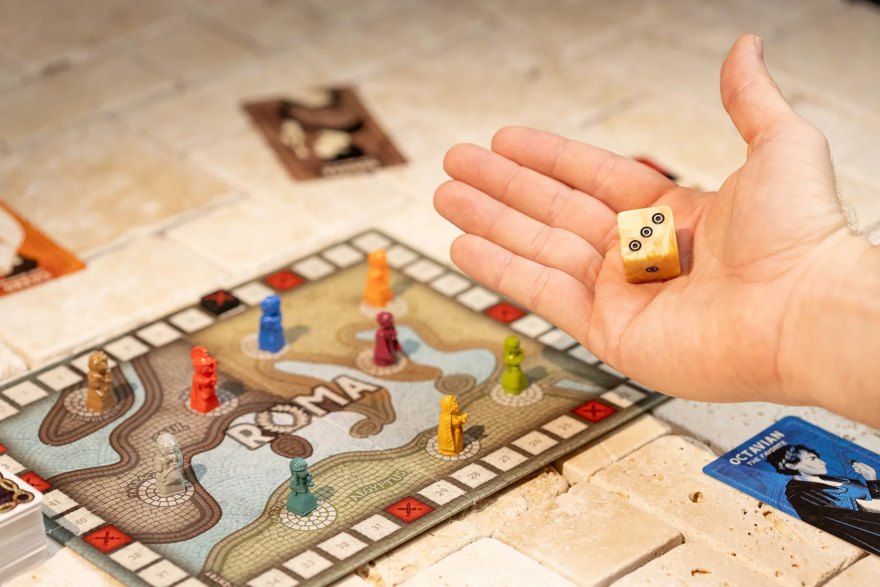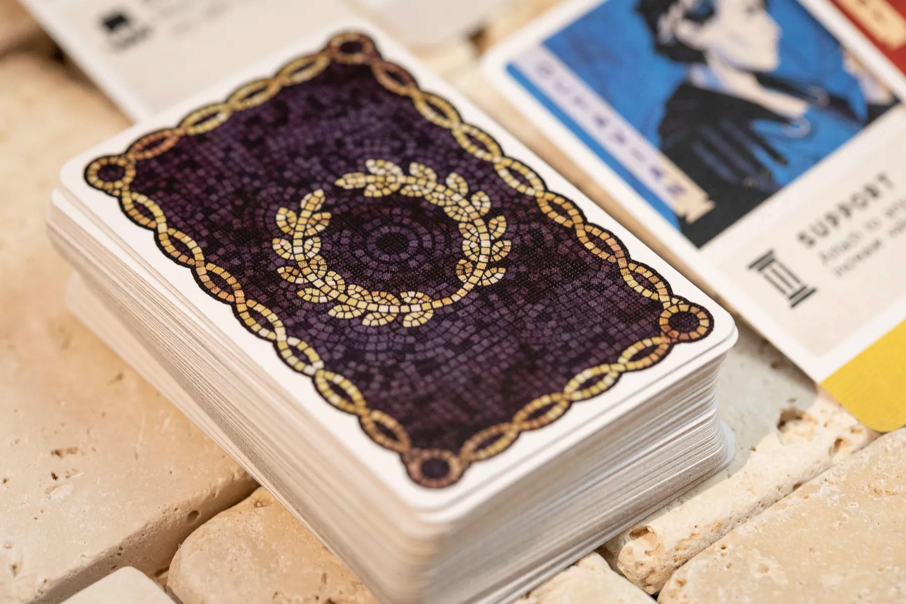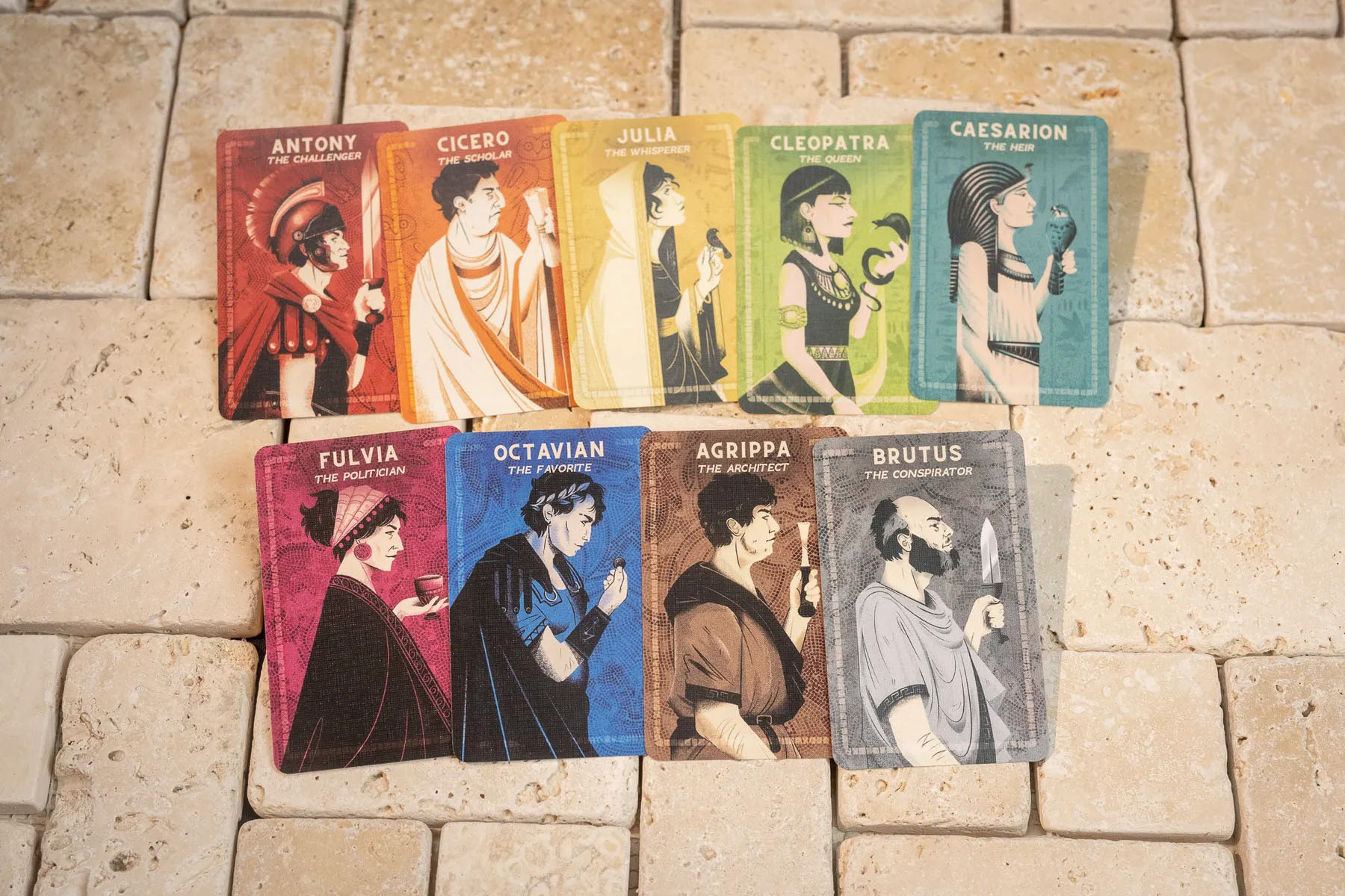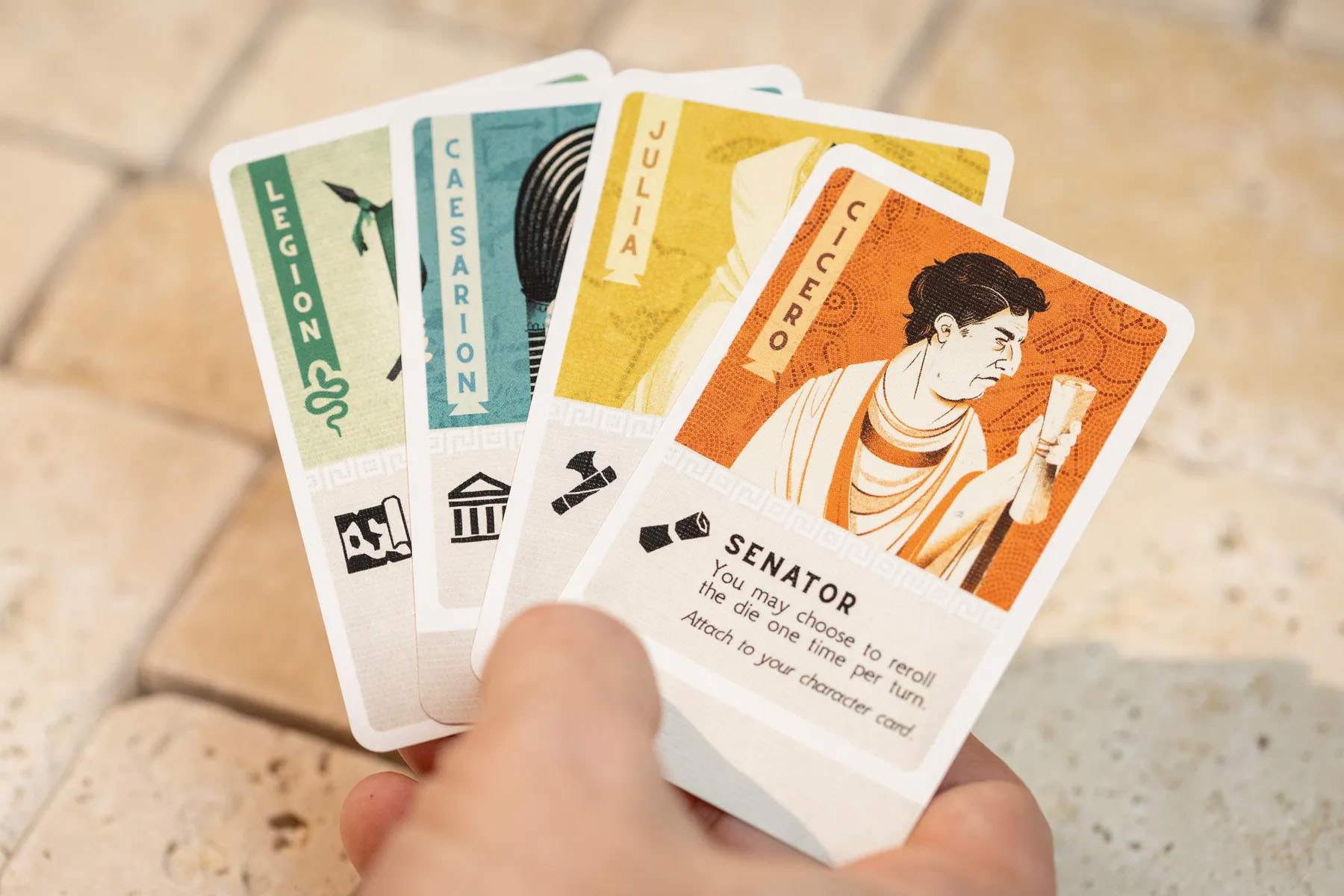 ROMA XLI comes with an assort of player pieces, including coins, game board, tokens and playing cards. This included design challenges such as illustrating complex mosaics, creating a clear iconography system, and prepping files for metal tokens. It was also important to establish a solid look and feel, so all components worked as a unit.