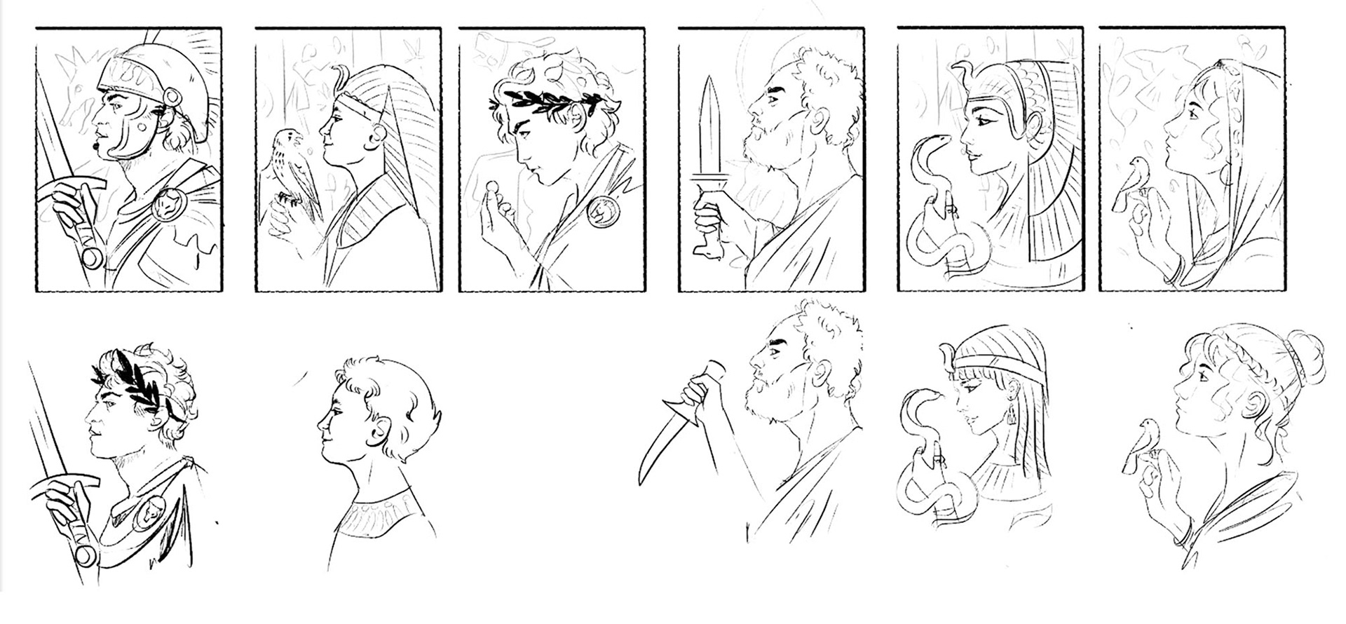 As with all my projects, the design process begins with sketching. Much of it is done on paper, and then the strongest concepts are refined digitally for client presentation. Once aesthetic was established, I explored expressions for each individual player character, and selected a 'weapon of choice' for them to hold.